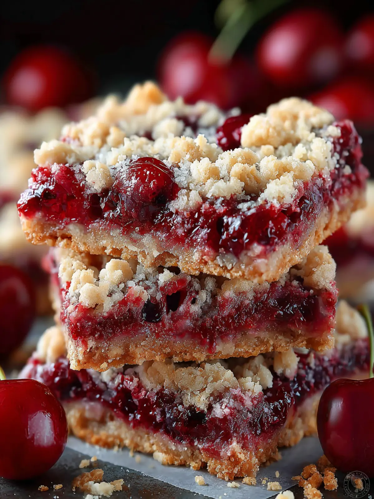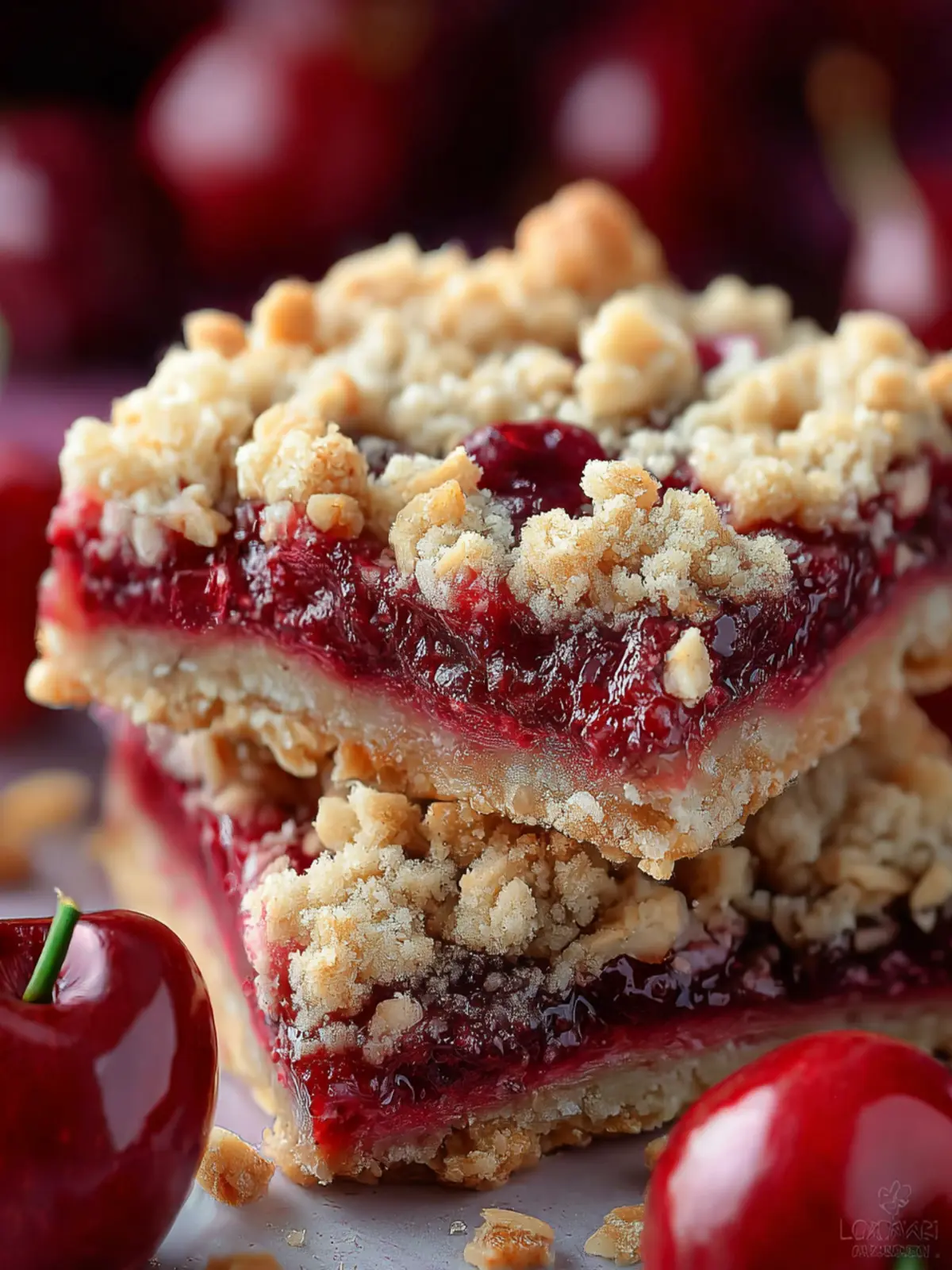 Delicious cherry almond bars topped with a crumble, perfect for dessert or a sweet treat.