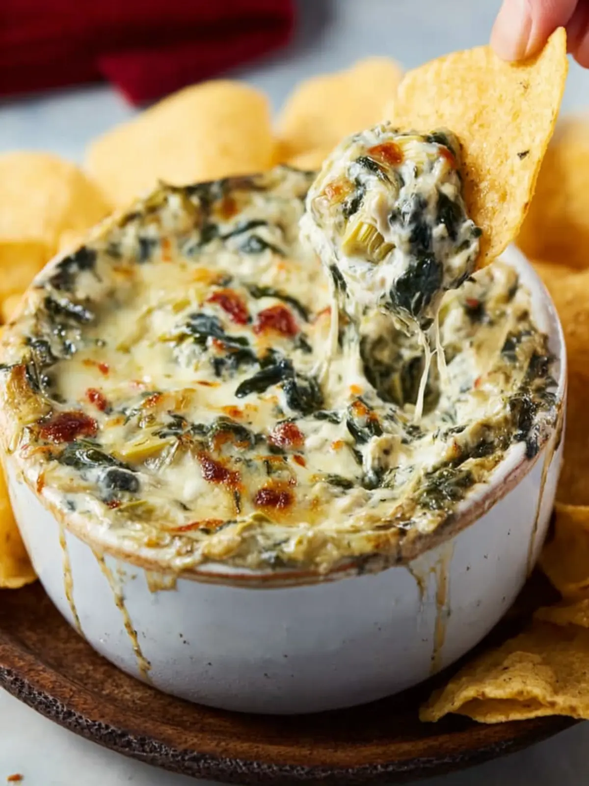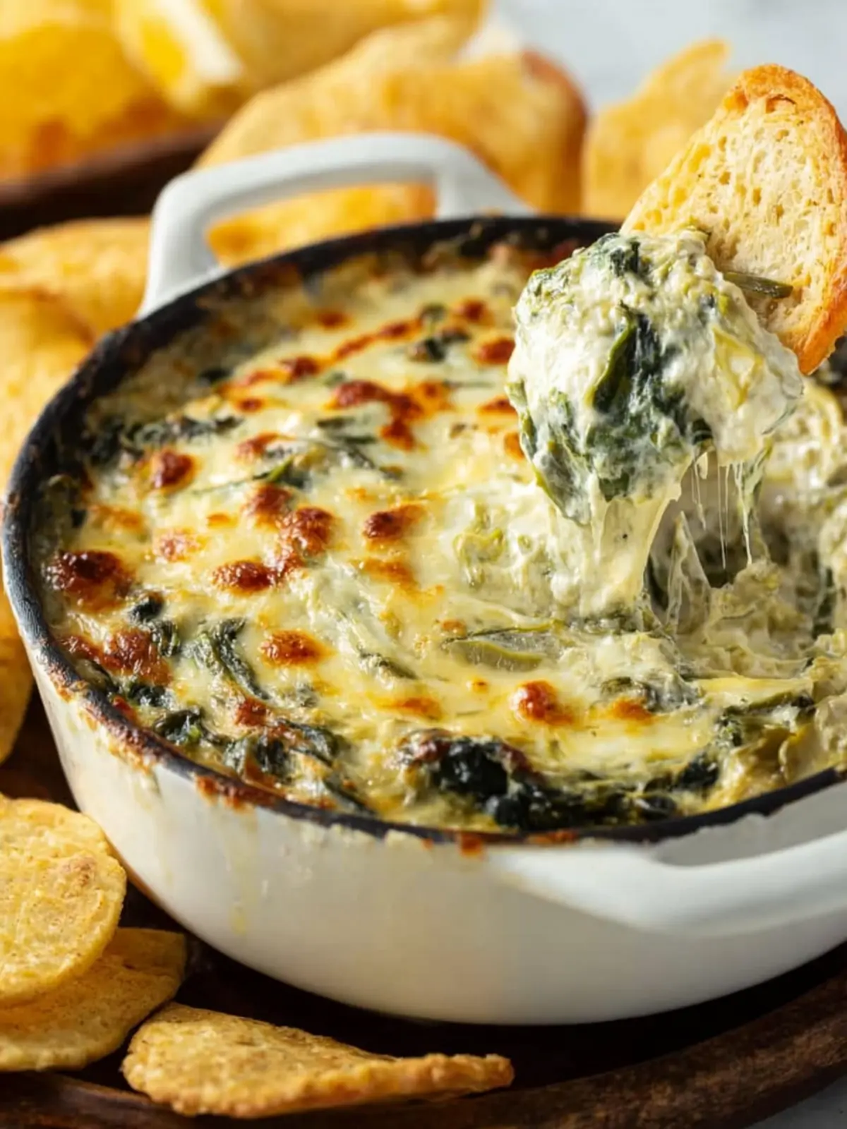 This creamy spinach artichoke dip is the perfect appetizer for any gathering, served warm with your favorite chips, bread, or vegetables.