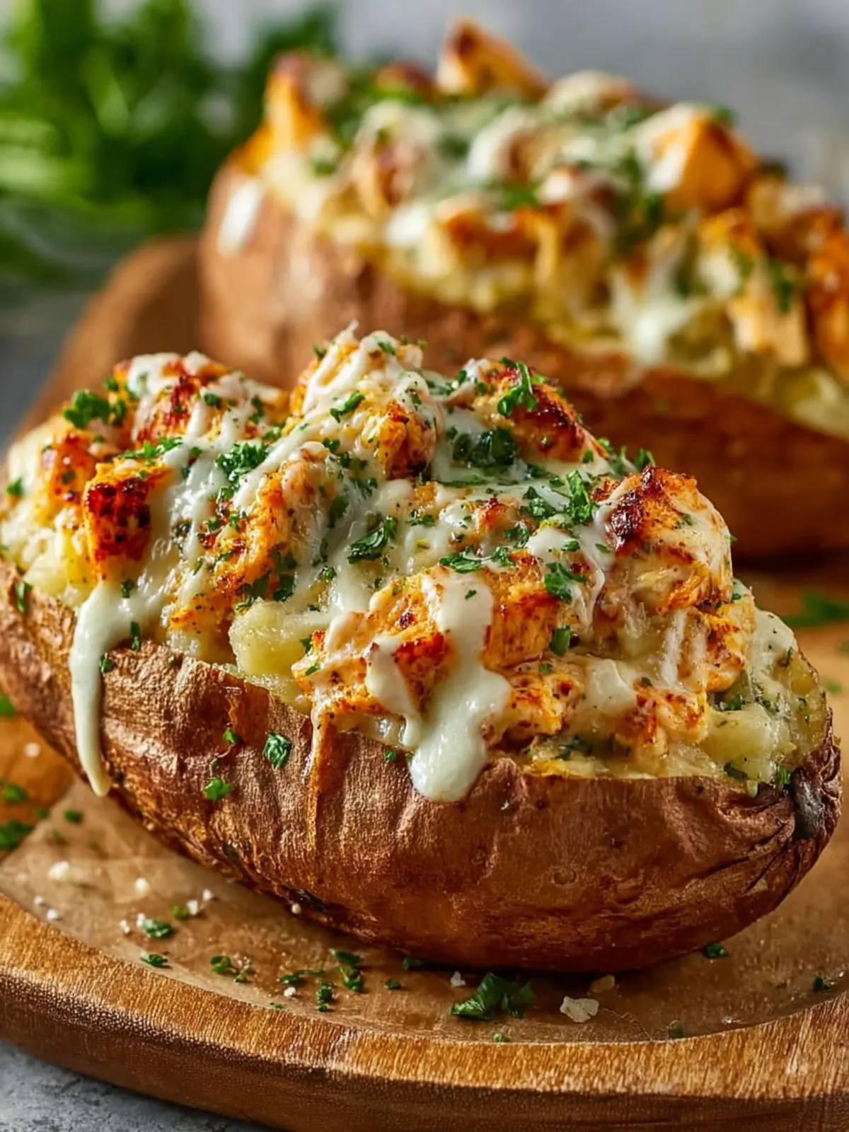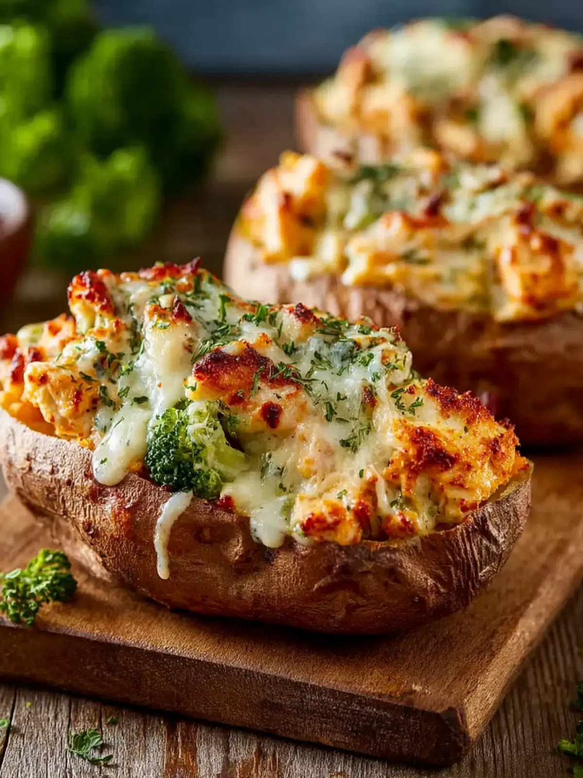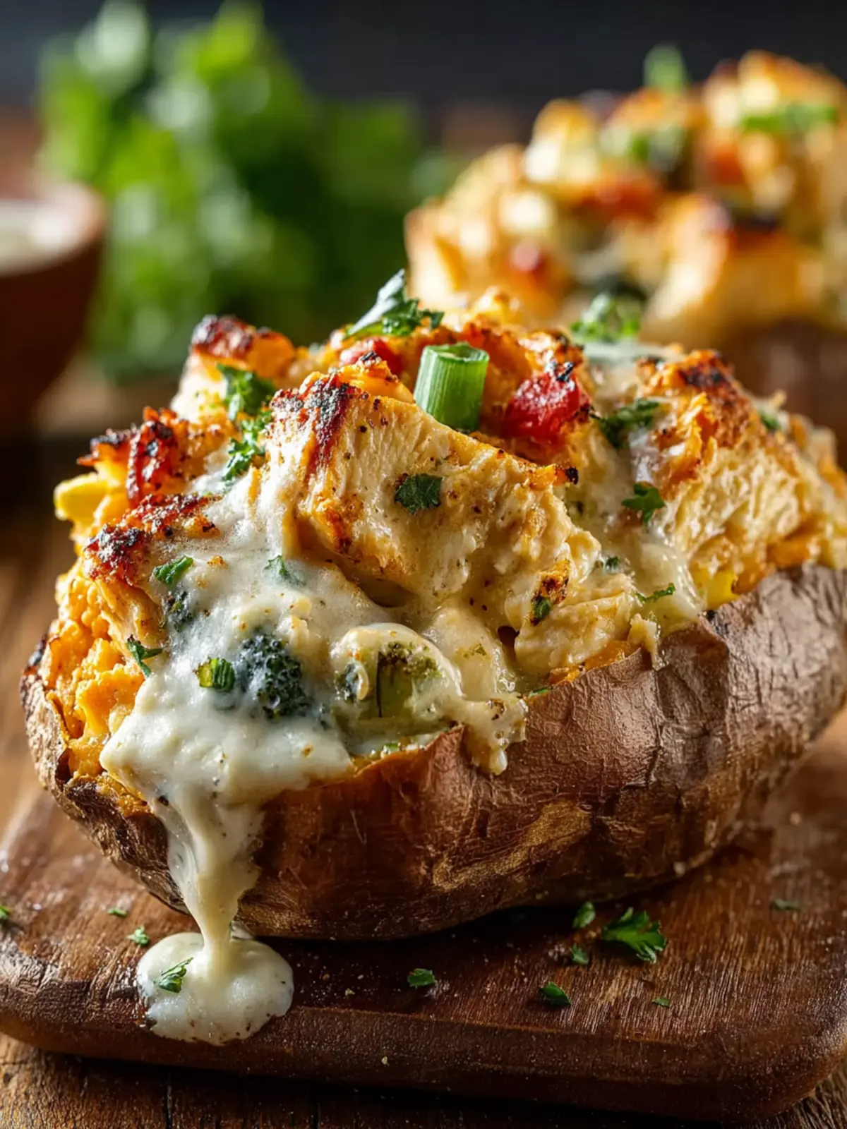 A delicious and hearty stuffed sweet potato recipe filled with creamy chicken and vegetables.