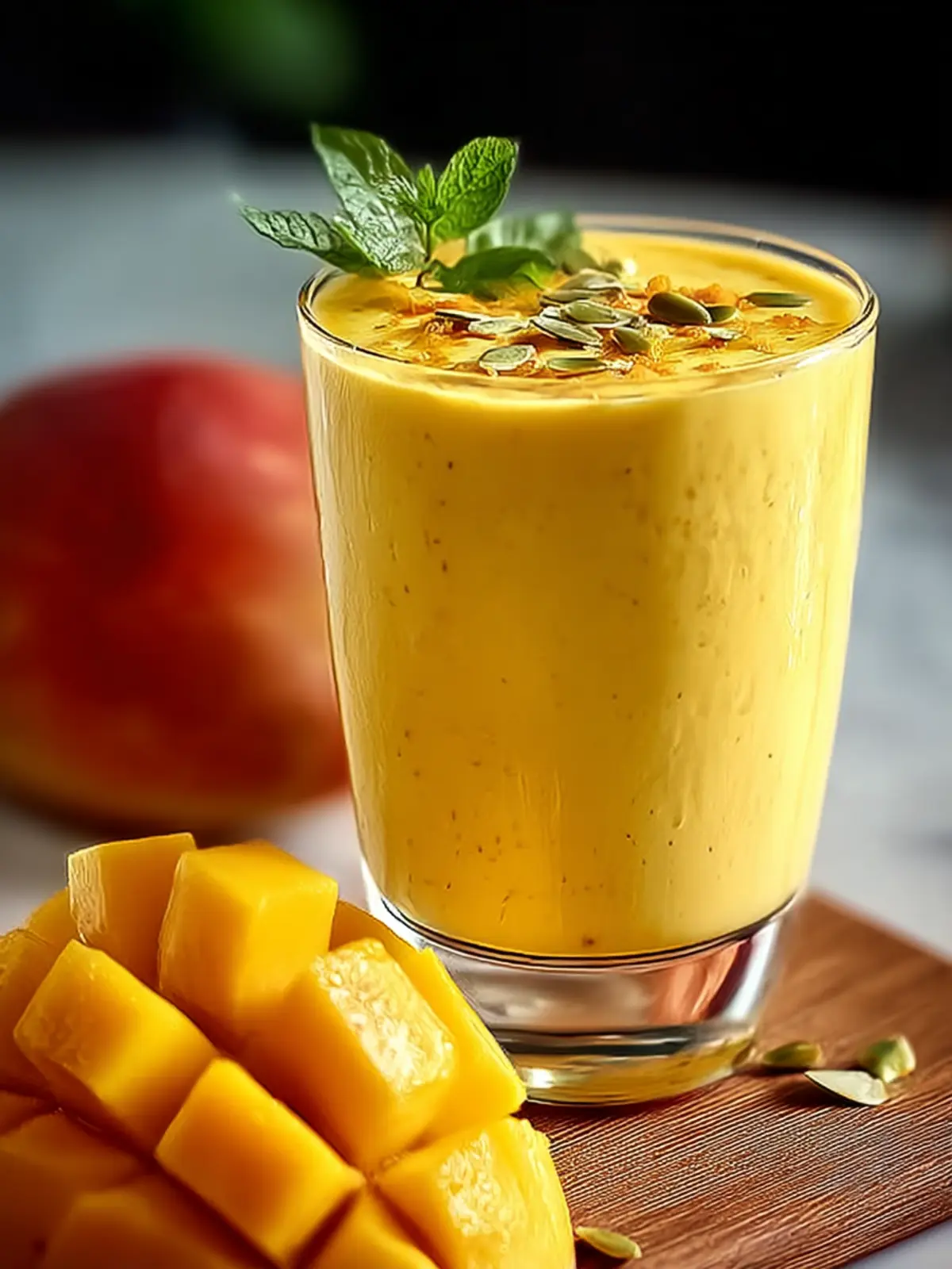 A refreshing mango lassi made with ripe mangoes, yogurt, and a touch of sweetness.
