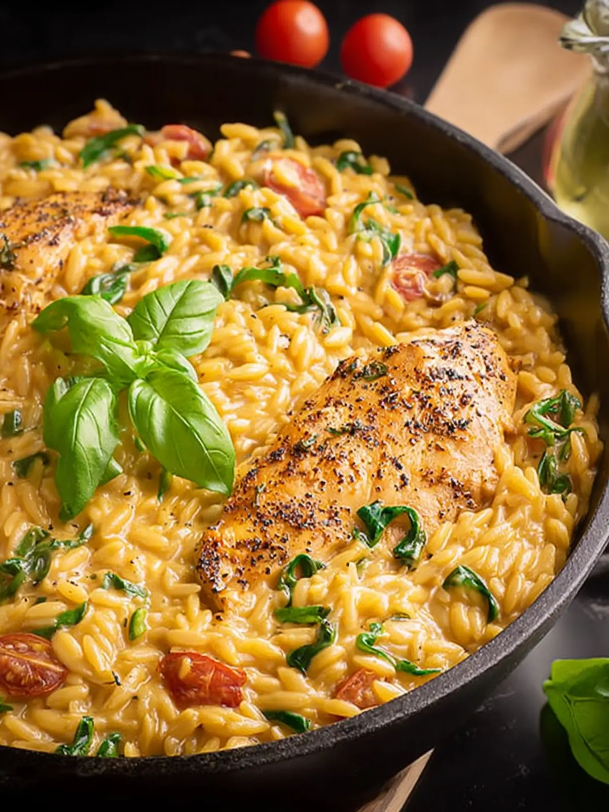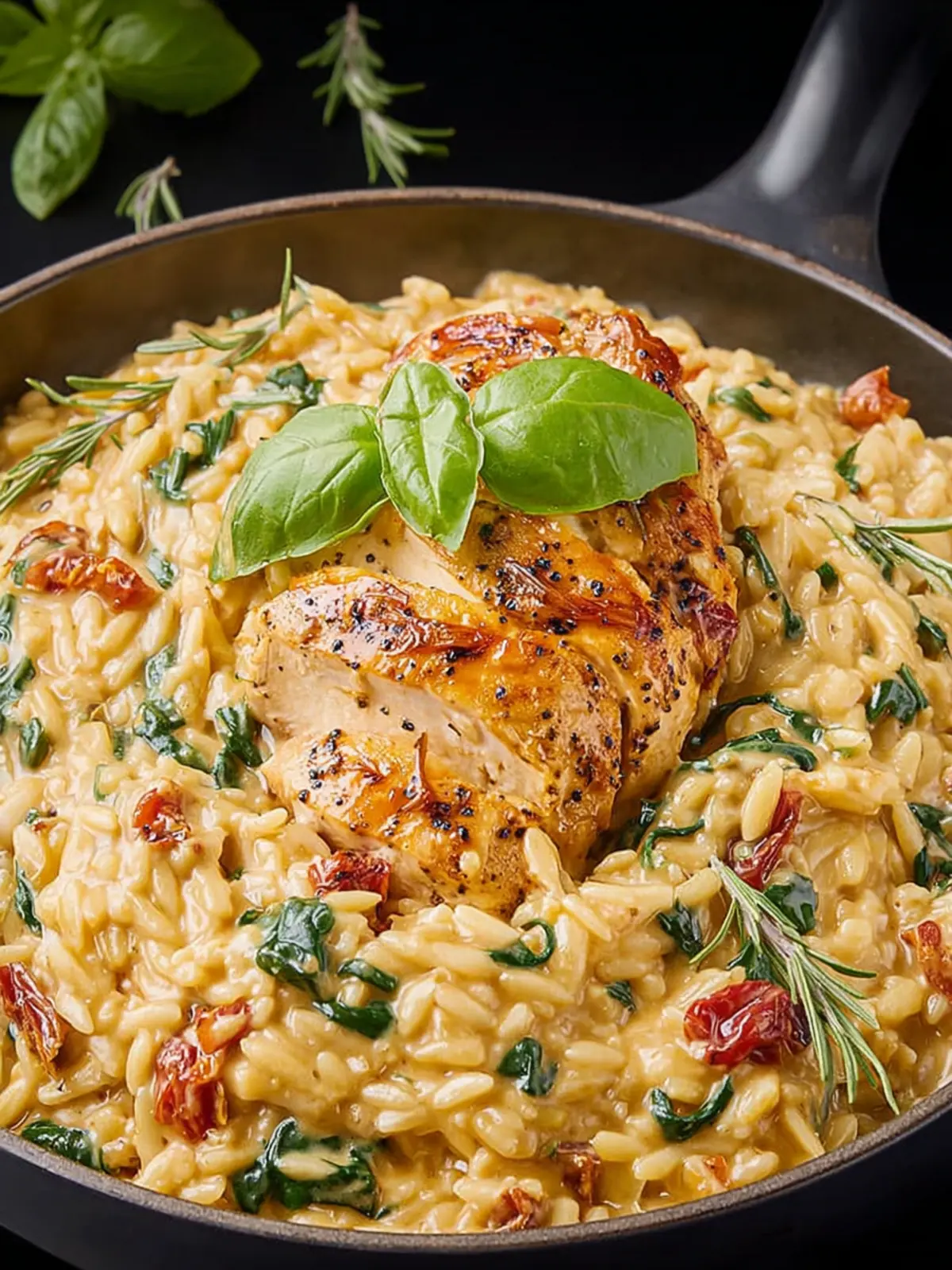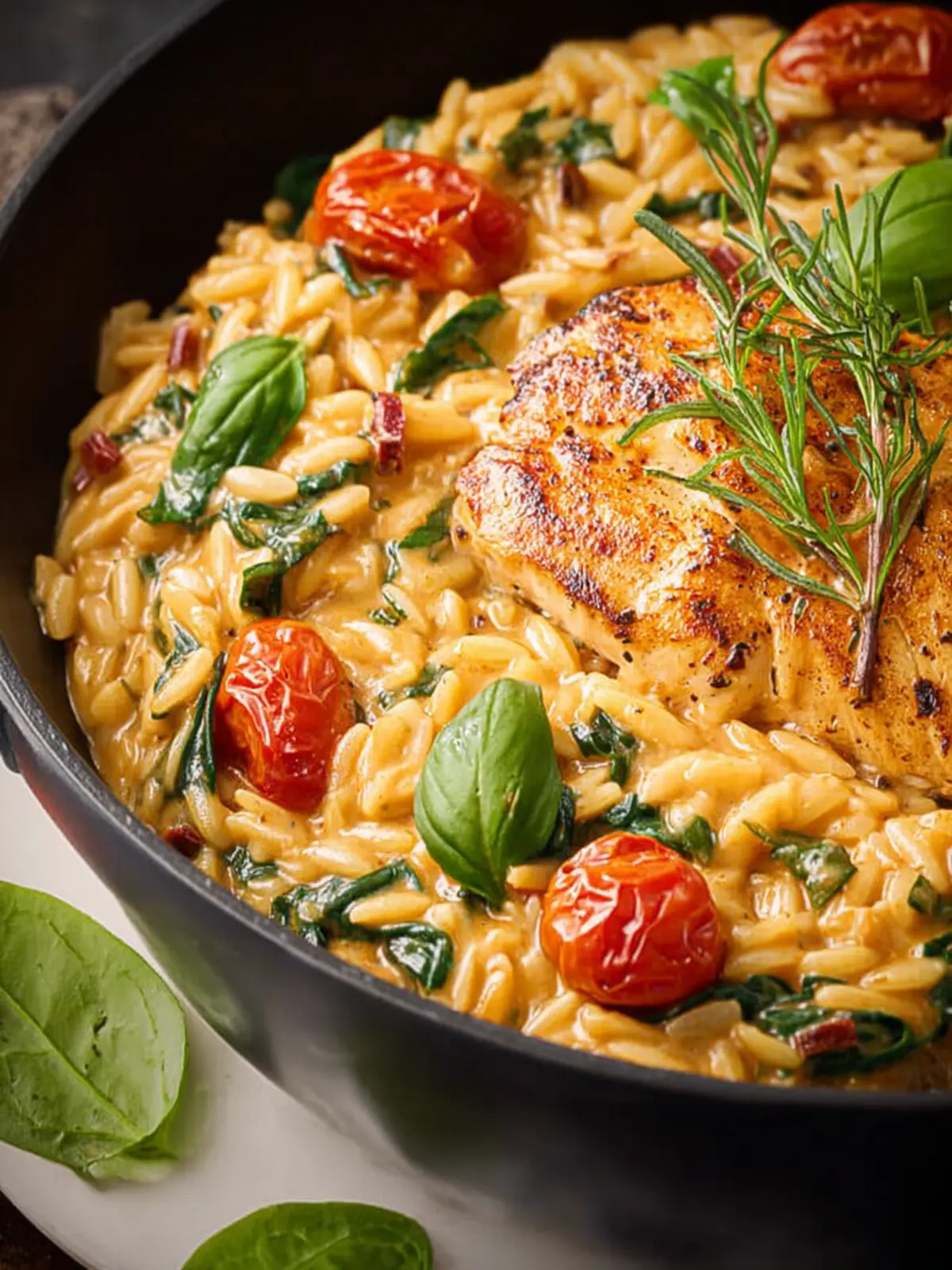 A delicious creamy chicken orzo dish with sun-dried tomatoes and spinach, perfect for a comforting meal.