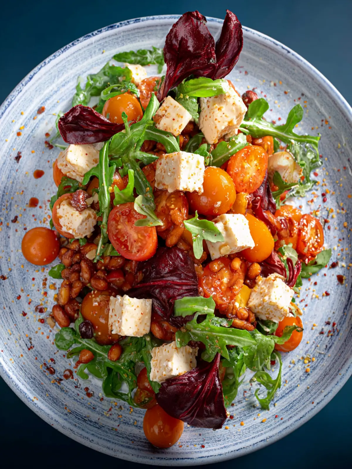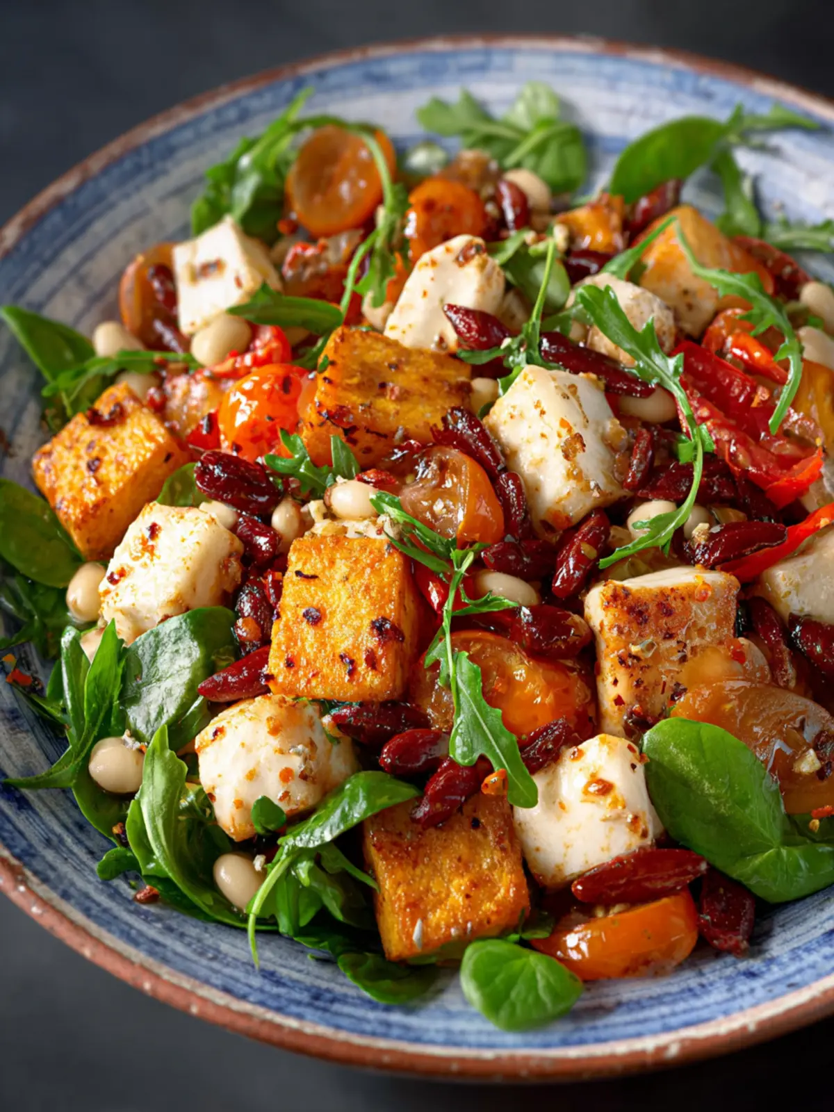 A delicious salad featuring crispy tofu, white beans, and sun-dried tomatoes.