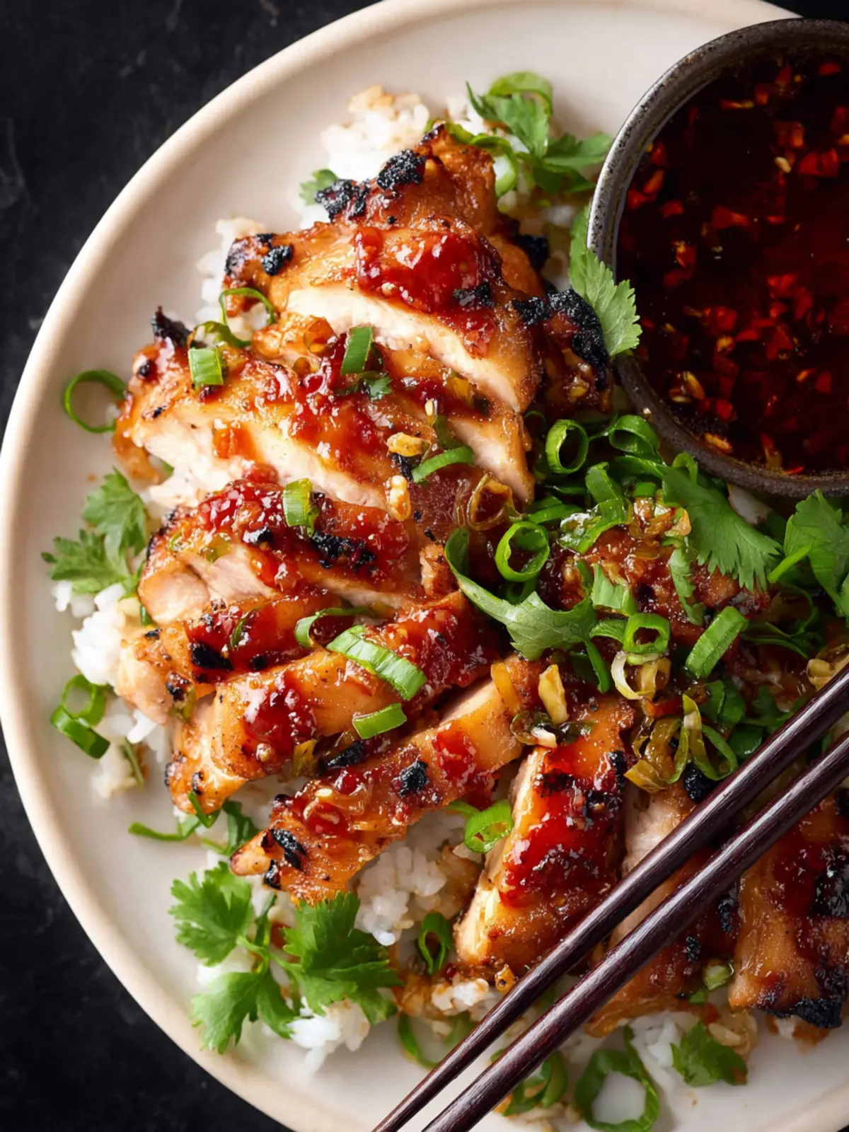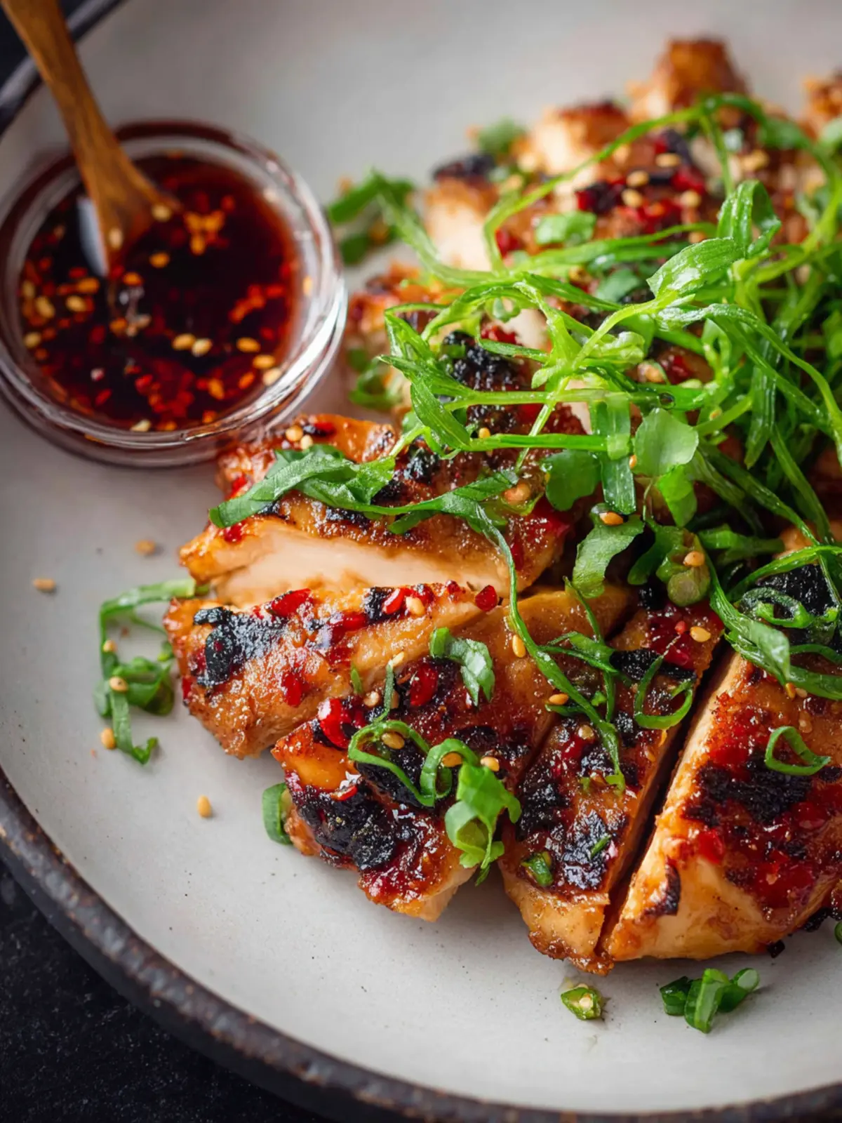 - Remove the chicken from the oven and let it rest for five minutes before slicing. Transfer it to a serving plate and scatter over the sliced scallion, cilantro leaves, the chili jam if you’re using it, and sesame seeds.