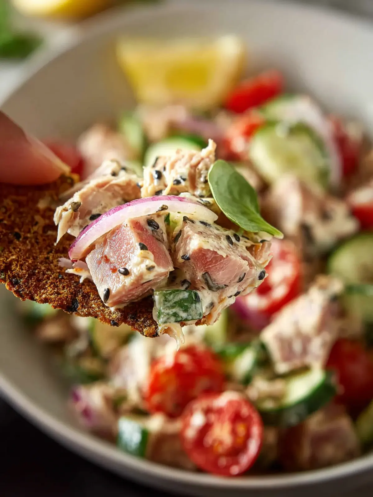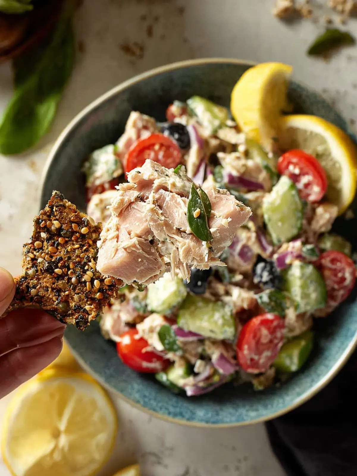 Wholesome Ingredients: Packed with protein-rich tuna, crunchy cucumbers, and vibrant cherry tomatoes, this salad is full of nutrients while being incredibly delicious. You won’t miss the mayo; the freshness of lemon juice and olive oil brings brightness and depth to each bite.
