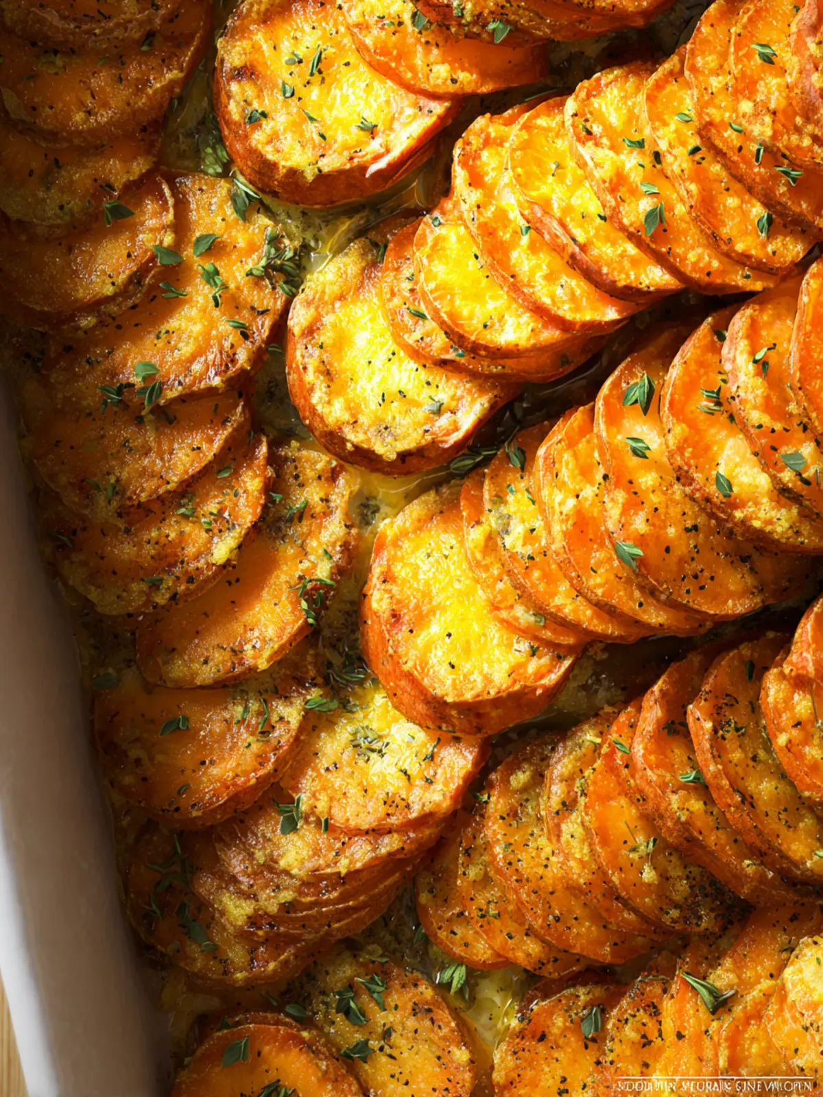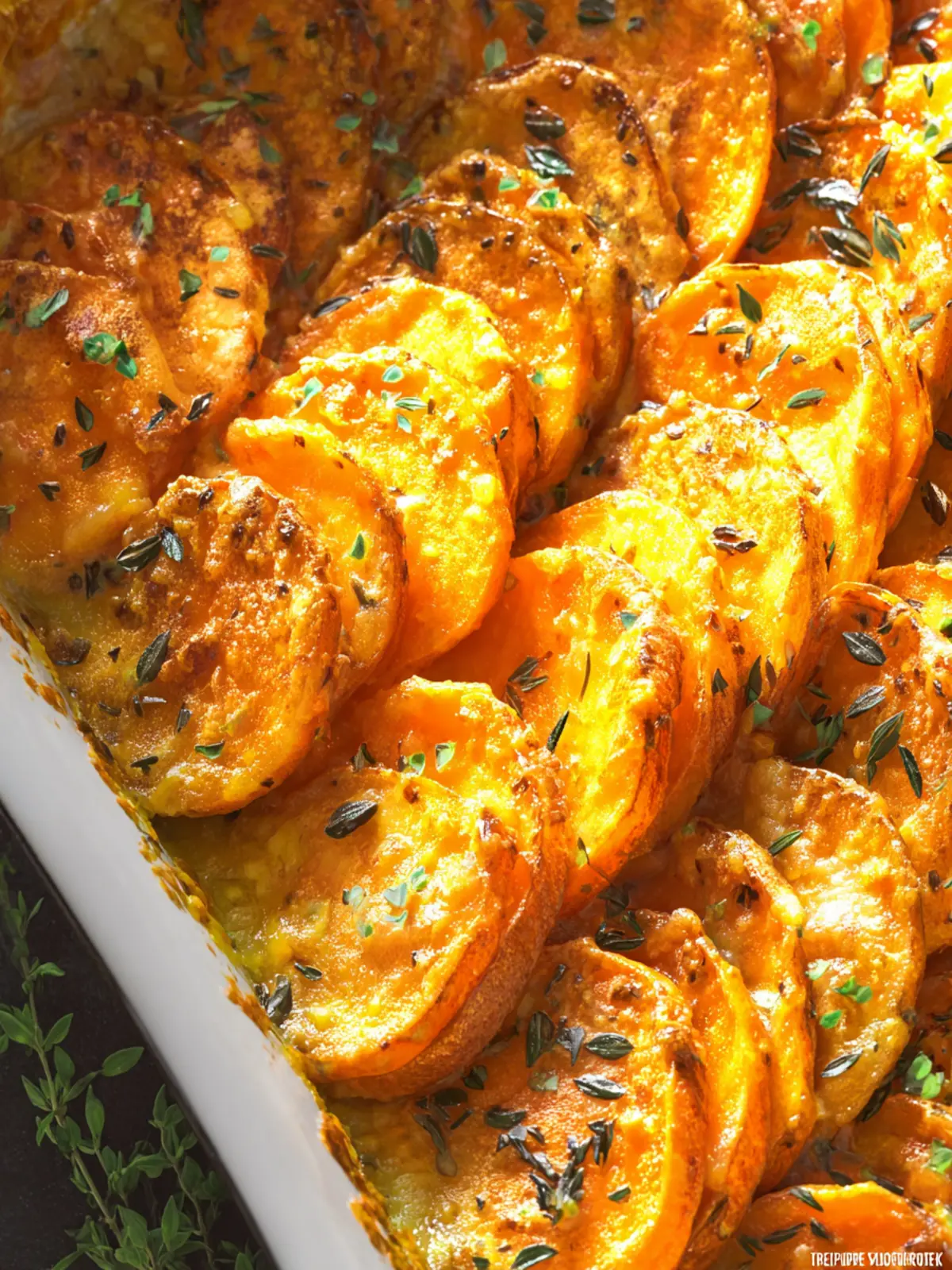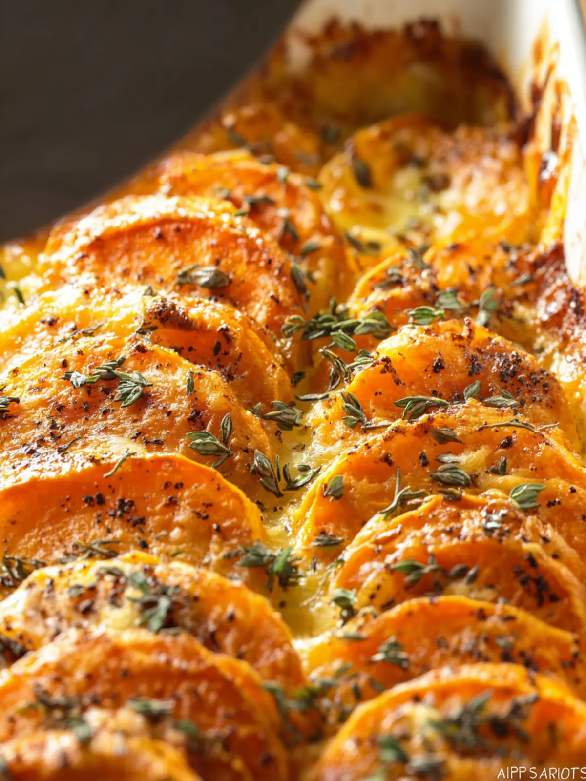 Flavorful Layers: The layers of thinly sliced sweet potatoes soak up creamy goodness, absorbing the flavors of garlic, herbs, and cheese. Each bite is a symphony of taste and texture.