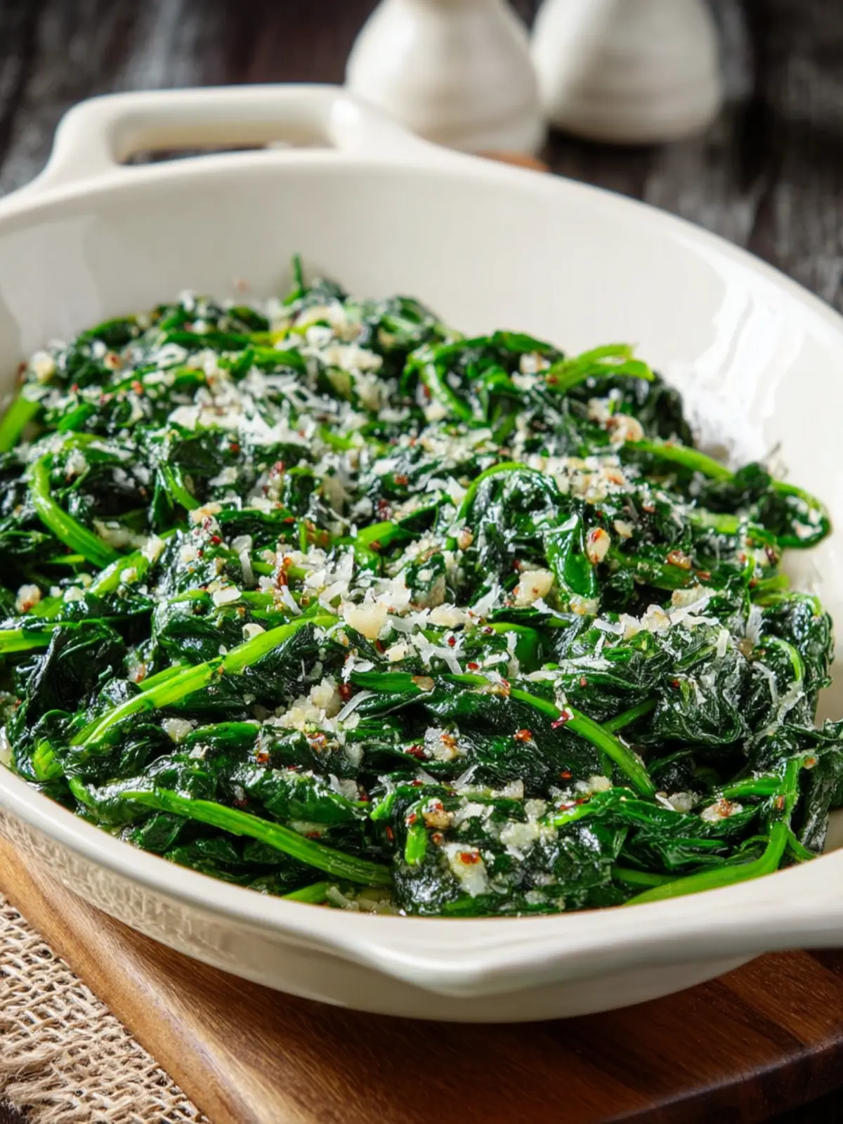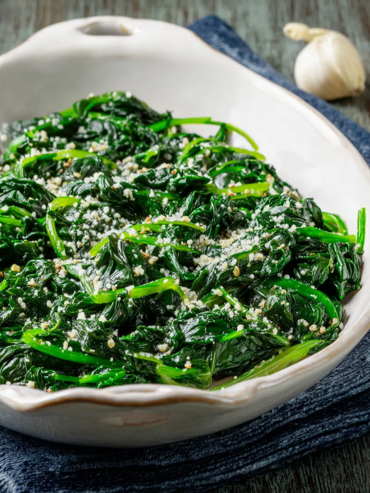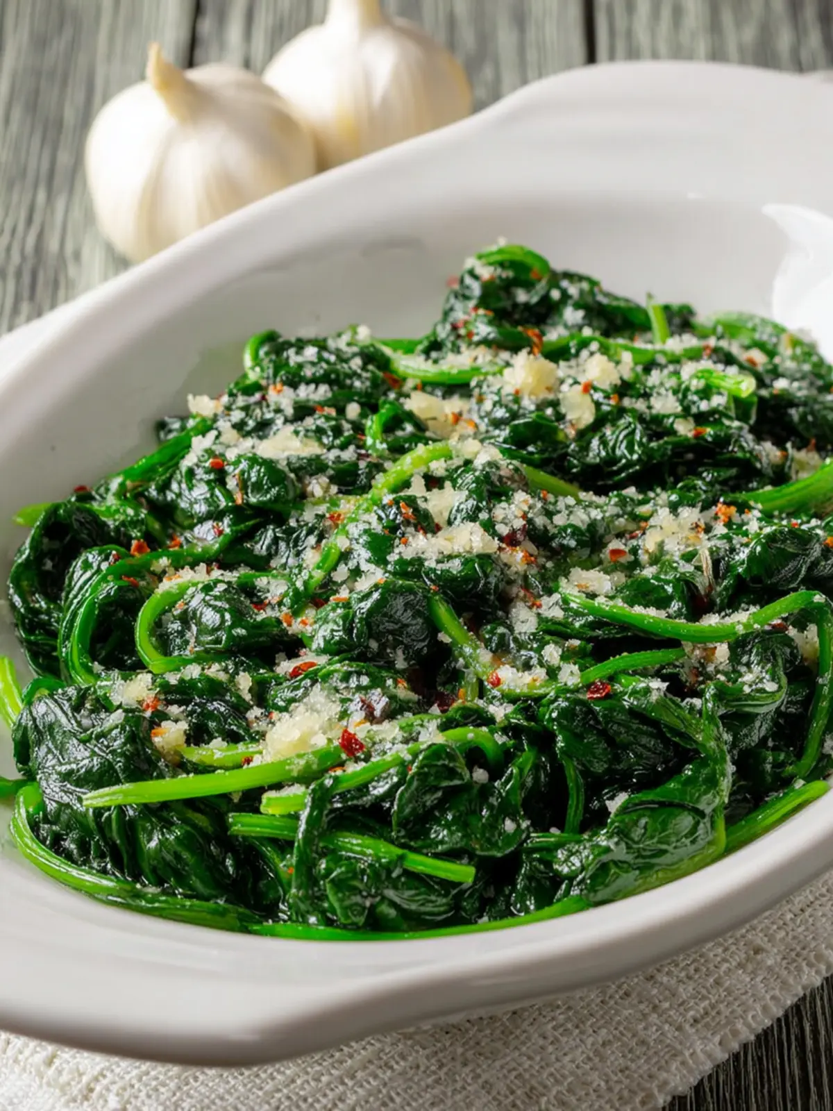 A quick and healthy stir-fried spinach dish seasoned with garlic and parmesan.